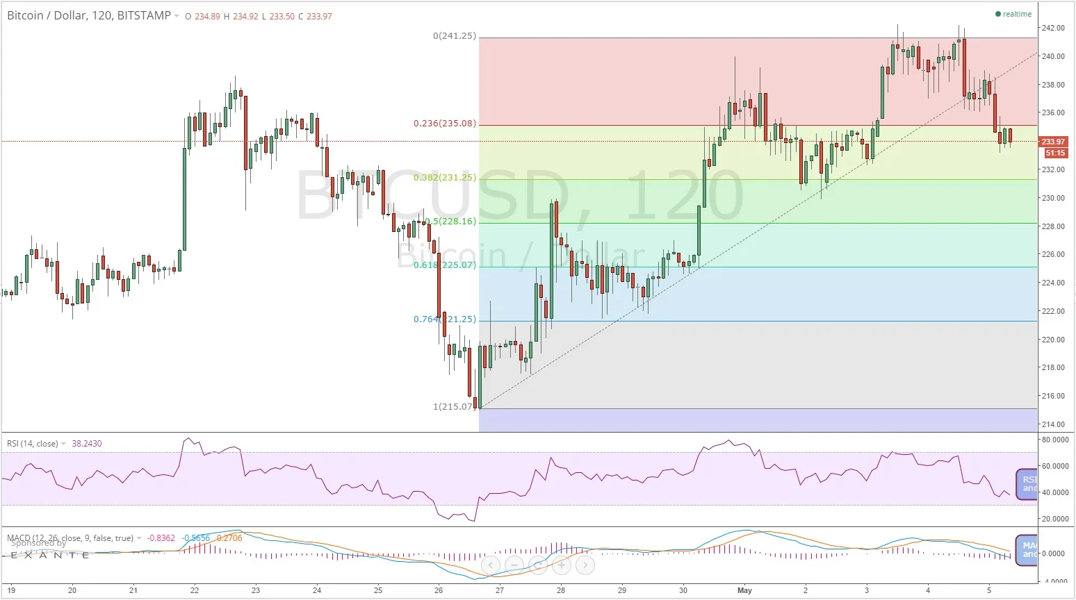 “The price has broken below some significant levels and looks like it's going to test some very important levels below. The 50-day EMA has been a massive wall and it looks like the price has run out of energy trying to get and stay above it. Now a big test is coming, as price has broken below US$231, which has been mentioned in many previous articles as an area that needed to hold. Look for US$220 and the massive support area of US$210 to be tested.”